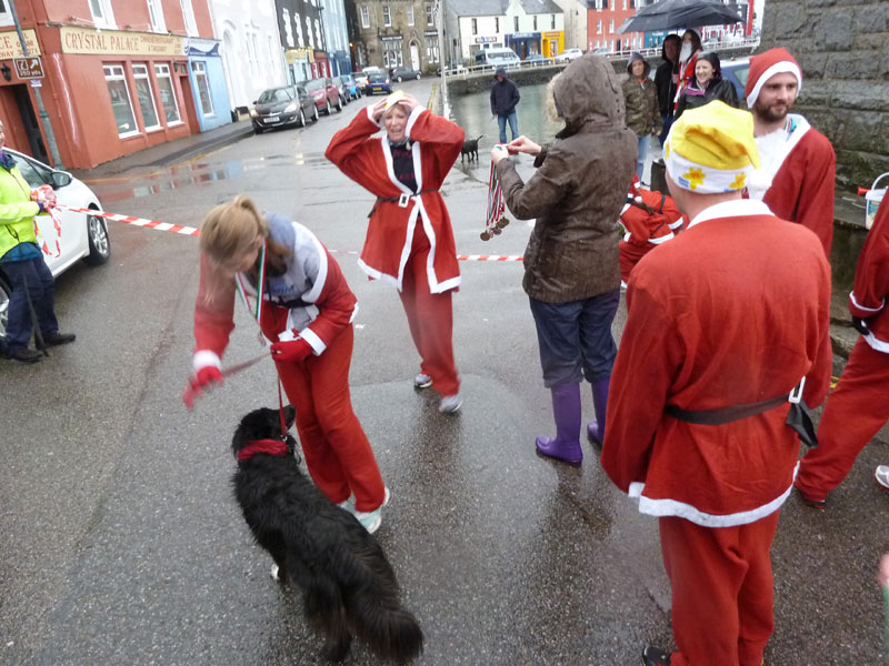 The Santa Dash takes place along the Main Street of Tobermory on the last Sunday before Christmas each year. This year was the fourth ‘running’ of the event and supports Marie Curie Cancer Care. This year we had 50 entrants, more or less split between children and adults. Registration is at the Lifeboat Station, and the Junior Race starts from here with the adults in hot pursuit along the street to Ledaig Car park, around the car park and finishes back at the clock. The adult race starts at the clock, goes along Main street, up out of Tobermory to the roundabout and then around the top of town, back down Argyll Terrace to the clock tower.